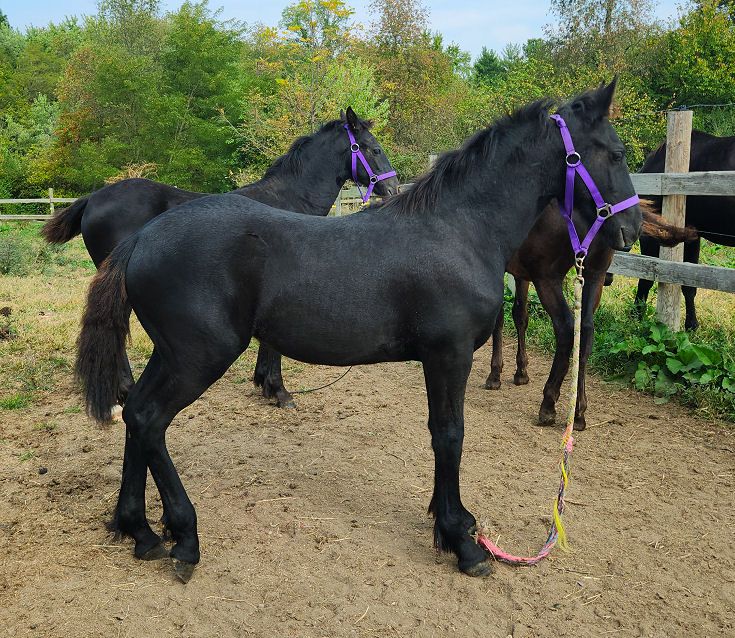 This colt is solid black. He is 7/8ths Friesian 1/8th Thoroughbred. He will be tall have the mega hair and look 100% Friesian without the Friesian high price.