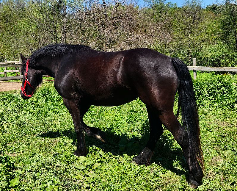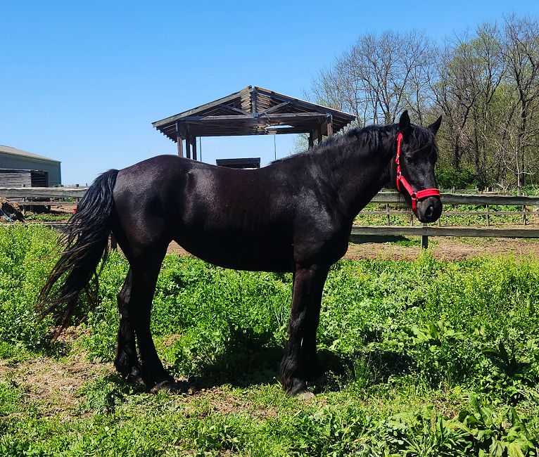 In the video above Valerie and her best friend Tessa were just dropped off at the Middle Grove farm to rejoin the herd. They were thrilled to be back. When Lily produced a filly in 2022. In 2024 we brought her in for some ground work and were impressed with how well she remembered her earlier training. She will be bred to Evan in 2026. She is going to be very tall. Lily and her sister Rosalie each stand a solid 17 hands, we expect Valerie to easily be as tall. Valerie is for sale as a 2/1 package for $16,000.00 The ONLY reason she is for sale is I am 71 years old. To see a video of her movement click HERE. This is the first time Valerie has been in the round pen and is doing wonderful.